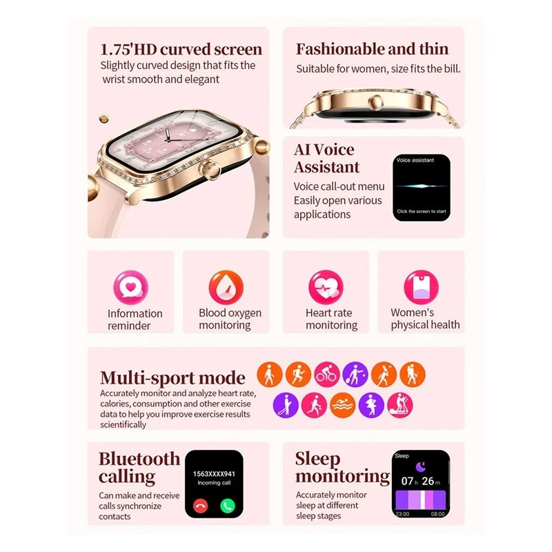 The 2.01-inch IPS TFT Smartwatch combines functionality, fitness, and fashion with features like Bluetooth calling, GPS tracking, and health monitoring. Powered by the JL7012A7 chip and connected through the Da Fit app, it offers sleep, heart rate, and female health tracking, along with multi-sport modes and social notifications. With a 360mAh battery, 1ATM waterproof rating, and magnetic charging, it’s built for everyday performance and active lifestyles.