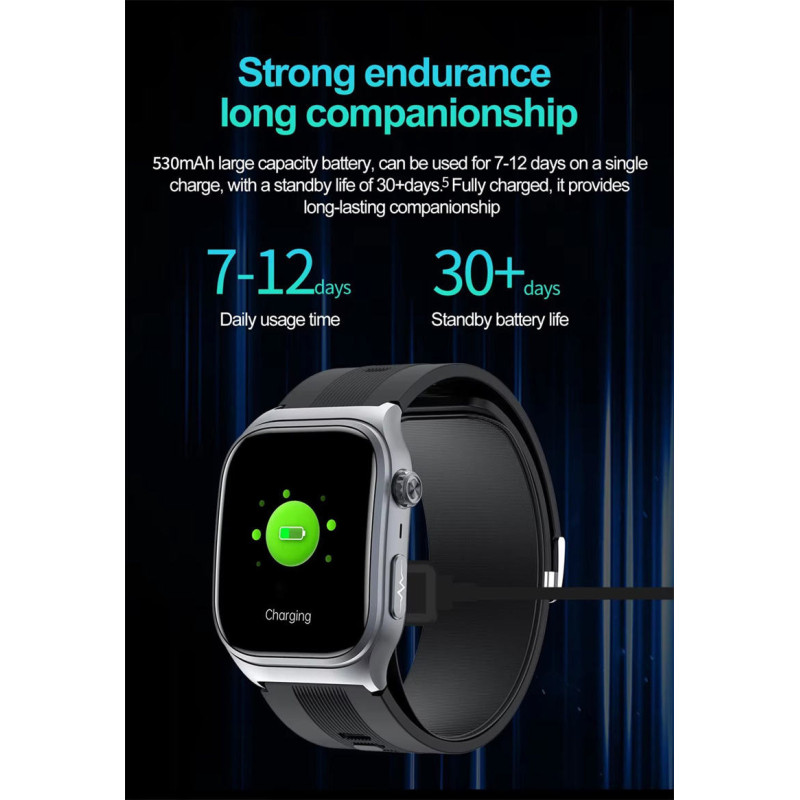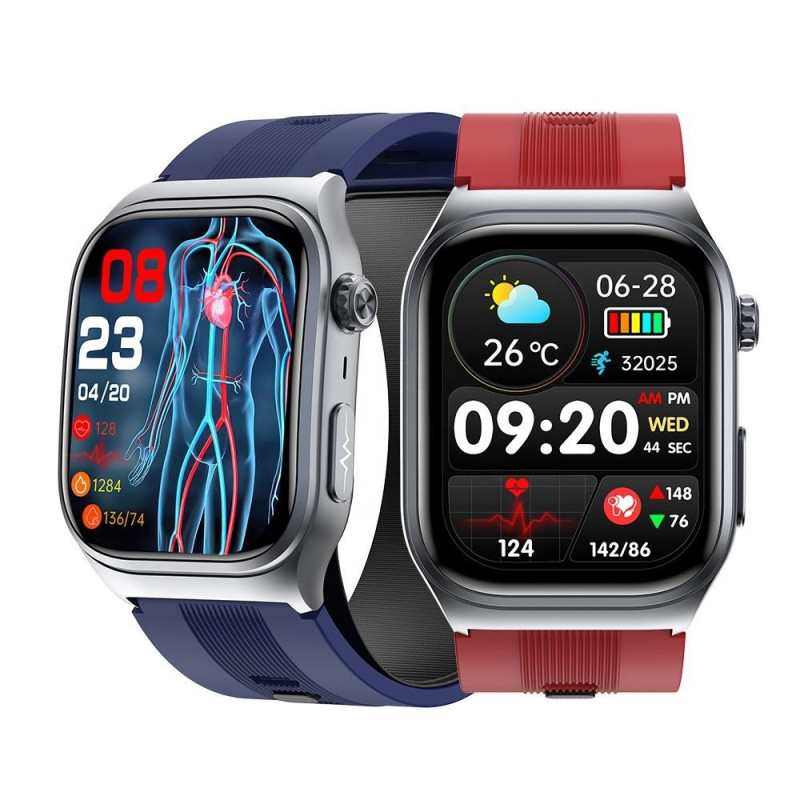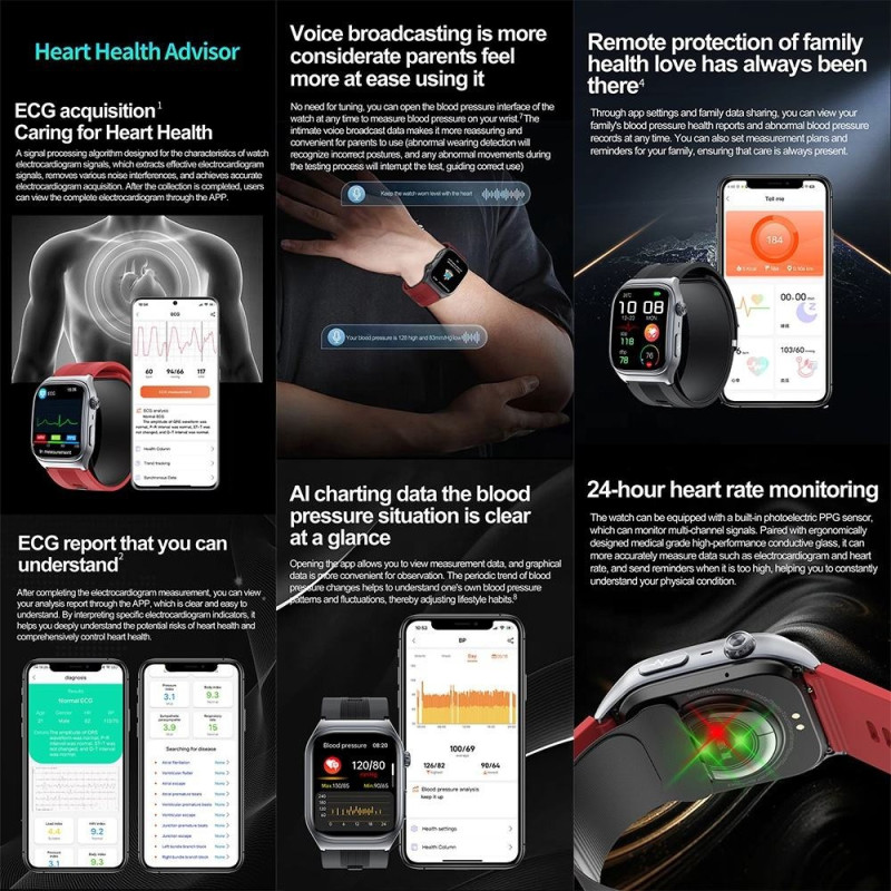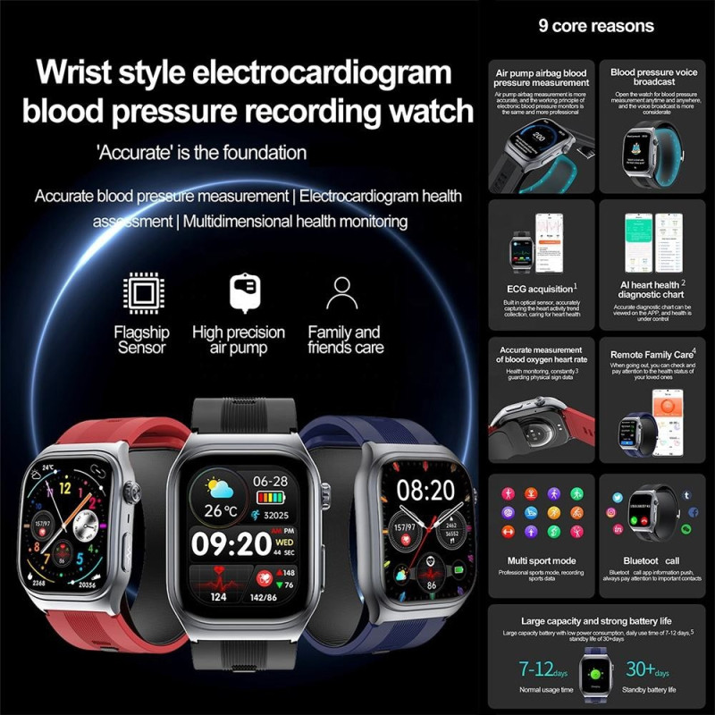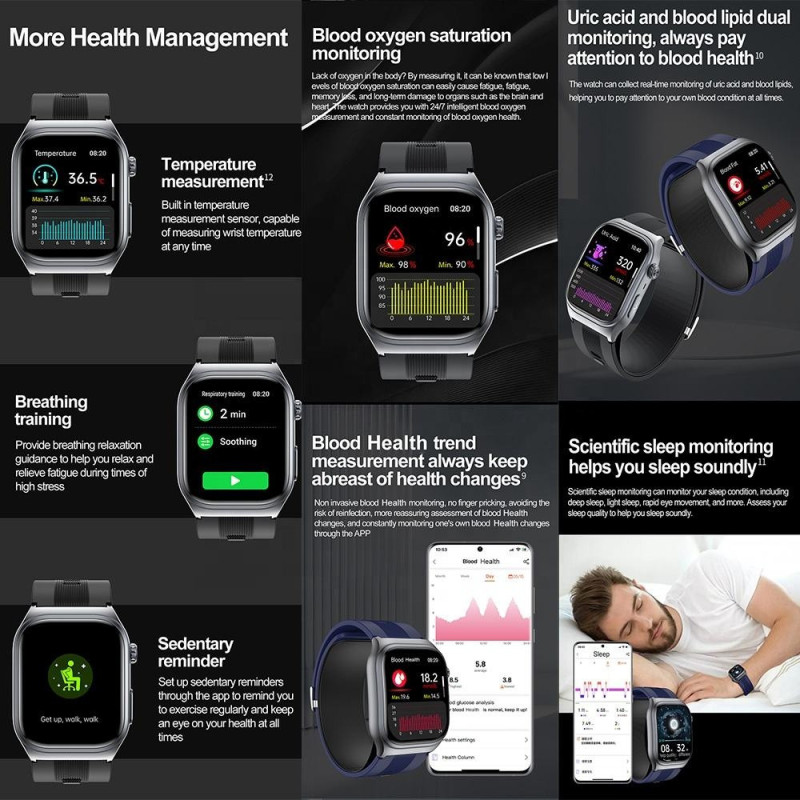 Air pump + balloon true blood pressure accurate test, 2.06-inch AMOLED retina touch screen, ECG nano glass, blood pressure voice broadcast, Bluetooth call, ECG electrocardiogram, AI intelligent diagnosis, blood glucose monitoring, uric acid monitoring, blood lipid monitoring, body temperature monitoring, blood oxygen monitoring, respiration rate, sleep monitoring, sedentary reminder and other health management functions, remote family and friend care, NFC function, call and message reminder, 530MA battery ultra-long battery life. Sports function: step counting/calorie/distance, multi-sport mode.