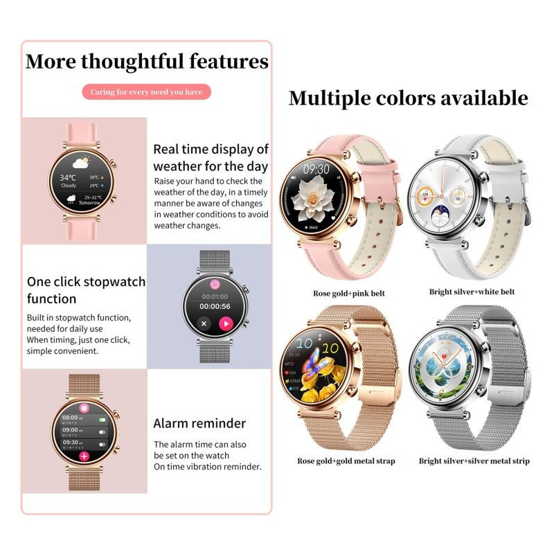 Bluetooth call, female physiological cycle, non-invasive blood glucose measurement, uric acid measurement, blood lipid monitor, SOS emergency call function, temperature monitor, blood oxygen monitor, respiratory training, heart rate , blood pressure, sleep monitor, intelligent voice assistant, weather forecast,step count/calorie/distance, multiple exercise modes, music control, business card, calculator, calendar.