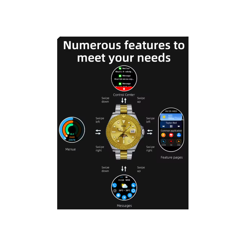 Bluetooth call, body temperature measure,information reminder,social app notifications push , sleep detection, hand up screen, alarm clock, dial setting, sedentary reminder, step counter,stopwatch, time display, SMS receiving, call reminder, exercise record, call record, heart rate, blood oxygen, music control, custom wallpaper.