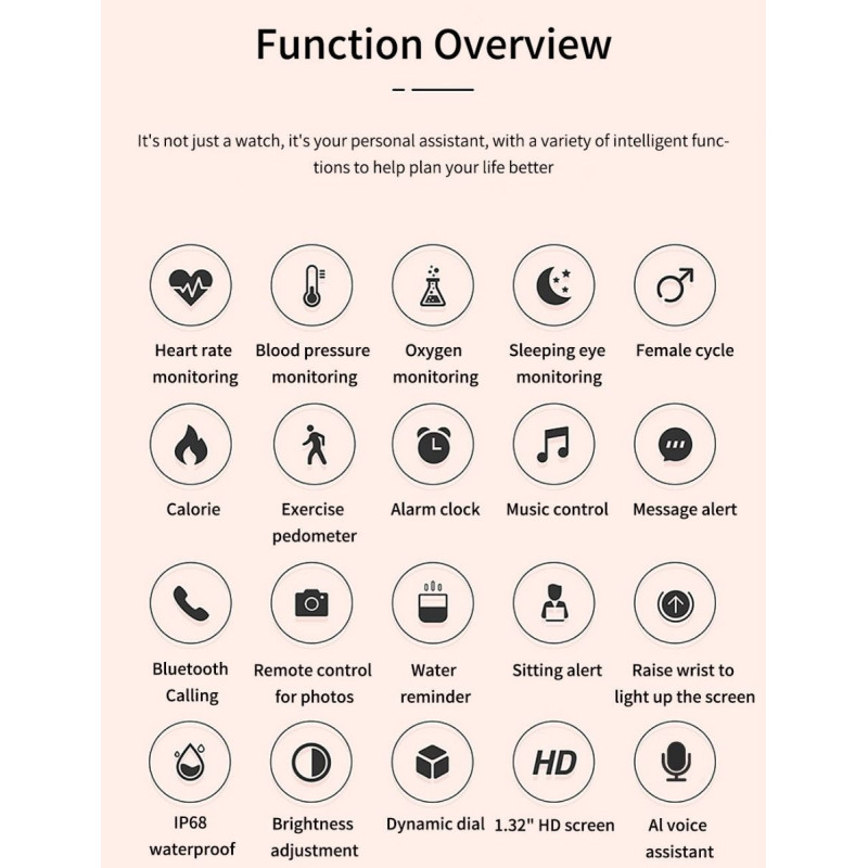 ECG , Bluetooth call, non-invasive blood glucose measurement, uric acid measurement, blood lipid monitoring, HRV-AI medical diagnosis, SOS emergency call function, body temperature, blood oxygen, respiratory training, heart rate, blood pressure, sleep monitoring,sedentary reminder, intelligent voice assistant, remote family and friend care function, female health, weather forecast, step count/calorie/distance, multiple sports modes, music control, business card, calculator, calendar, multiple languages.