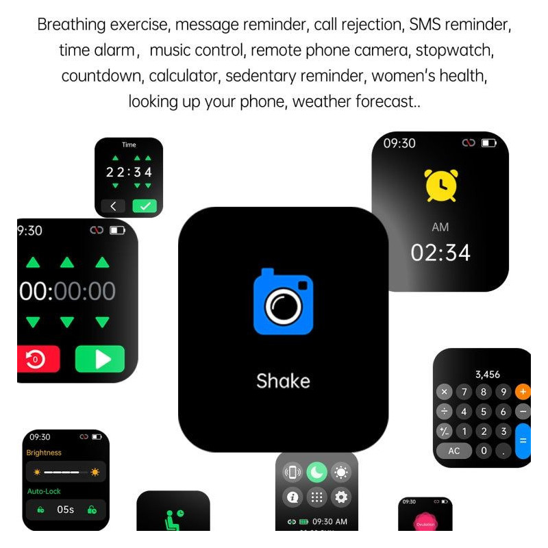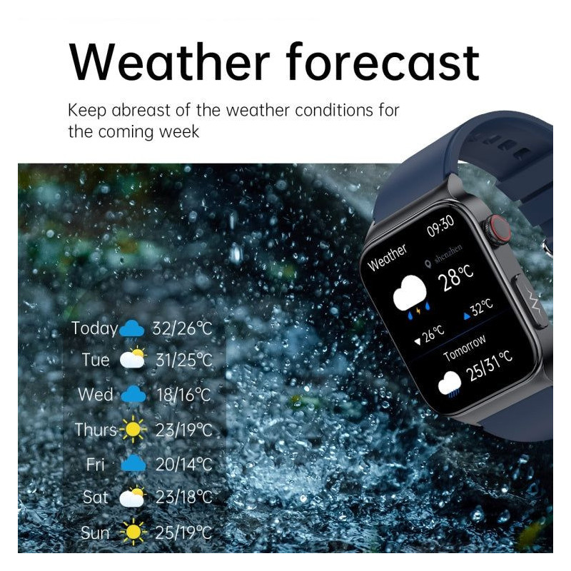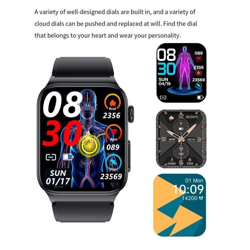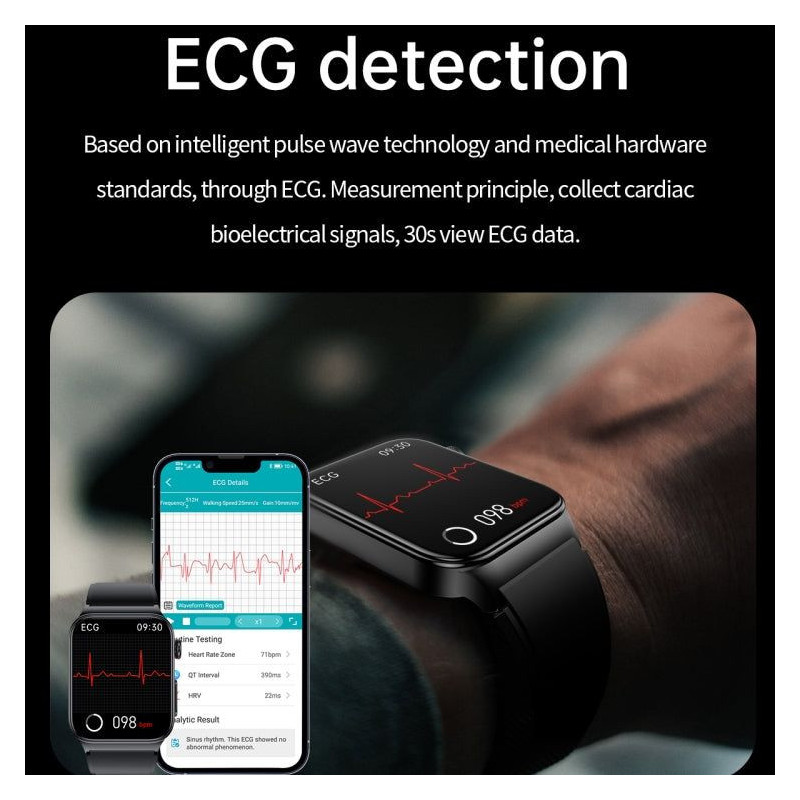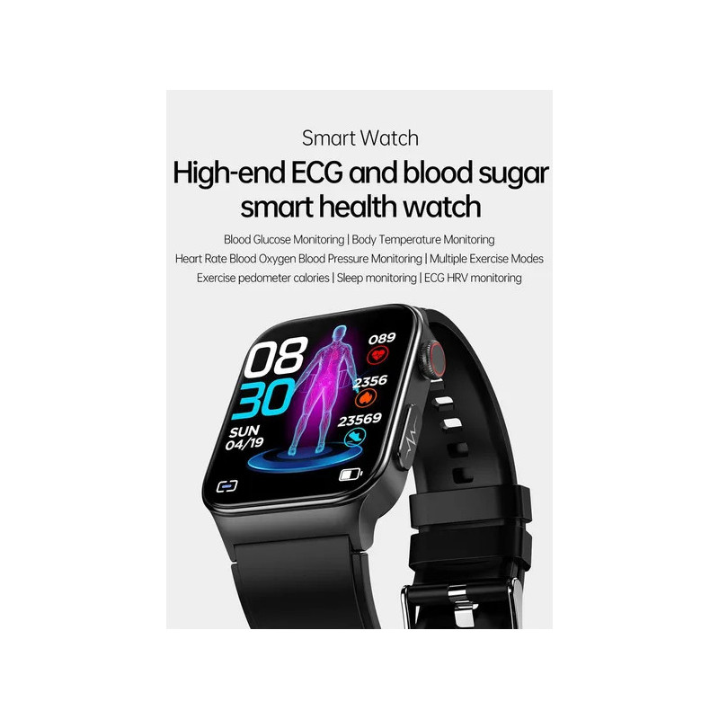 Intelligent ECG blood glucose health watch,ECG, chest patch real-time ECG analysis, ECG monitoring, non-invasive blood glucose, heart rate monitoring, blood pressure monitoring, blood oxygen monitoring, multi-exercise mode, custom dial, online multi- dial, exercise recording.Sleep monitoring, call and message reminder, silent alarm clock, remote photo, music control, sitting reminder, drink water reminder, weather display, countdown, shake to take photos, mobile phone search
