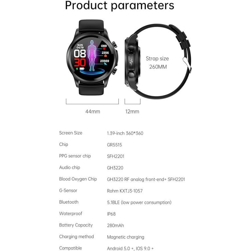 :Intelligent ECG blood glucose health watch,ECG, chest patch real-time ECG analysis, ECG monitoring, non-invasive blood glucose, heart rate monitoring, blood pressure monitoring, blood oxygen monitoring, multi-exercise mode, custom dial, online multi- dial, exercise recording.Sleep monitoring, call and message reminder, silent alarm clock, remote photo, music control, sitting reminder, drink water reminder, weather display, countdown, shake to take photos, mobile phone search