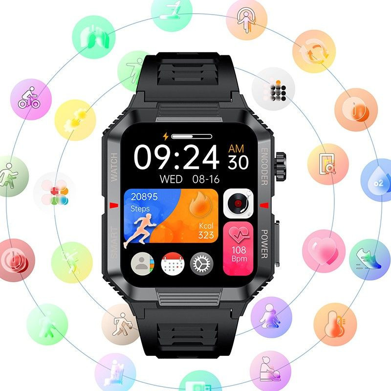 Meteorological data (pressure/UV/humidity/wind) ,Bluetooth call, female menstrual cycle, countdown, card management, Douk control, remote control photo, sedentary reminder, step counting, distance, calories, heart rate/blood pressure/blood oxygen/body temperature/blood sugar/ECG/sleep monitoring, mindfulness,Bluetooth music control, call reminder, SMS reminder, Social APP message reminder, alarm clock reminder, physical training, reject calls, multi-dial switch, custom dial,alipay,wechat payment,game.