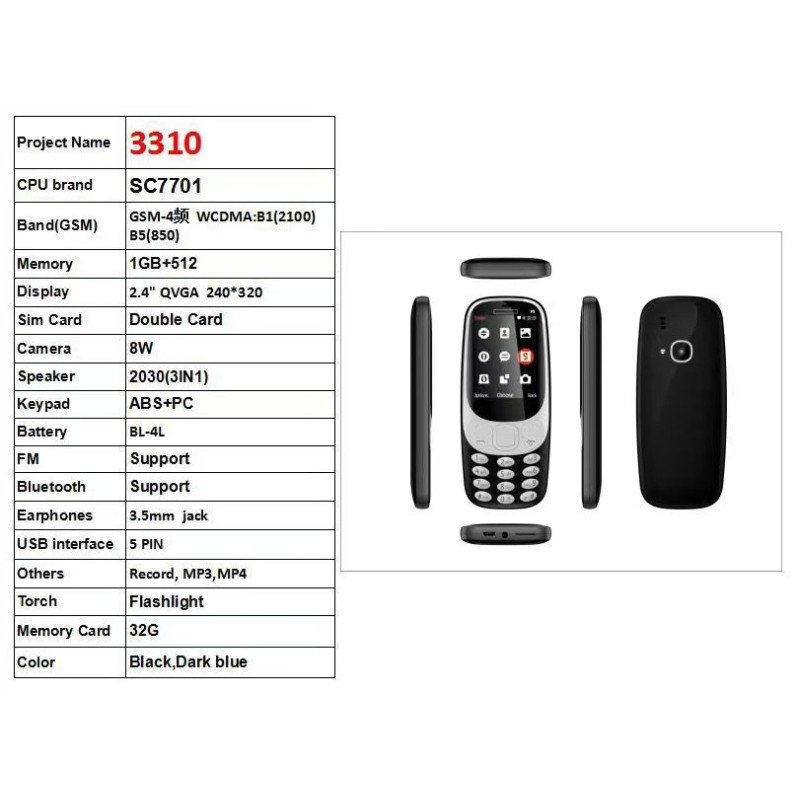 The 3310 is a classic yet modern phone featuring a 2.4-inch QVGA display, 8MP camera, dual SIM support, and expandable memory up to 32GB. With MP3/MP4 playback, FM radio, recording function, 3-in-1 speaker, flashlight, and Bluetooth connectivity, it’s a durable, stylish, and fully functional mobile phone perfect for both calls and entertainment.