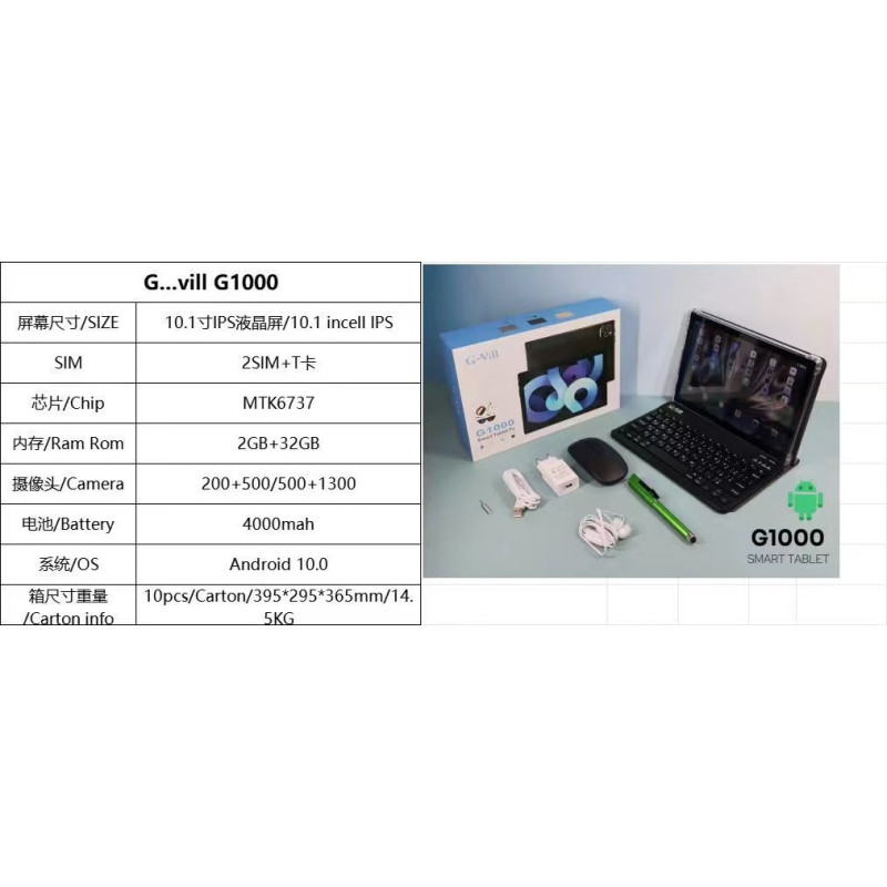 The G1000 is a 10.1-inch HD+ Android 10 tablet with 4G/3G/2G connectivity, 2GB RAM + 32GB storage (expandable to 64GB), 5MP rear camera, and 2MP front camera. Powered by a 4000mAh battery and featuring WiFi, GPS, and G-sensor, it’s perfect for browsing, streaming, gaming, and work, combining portability and performance in one sleek device.